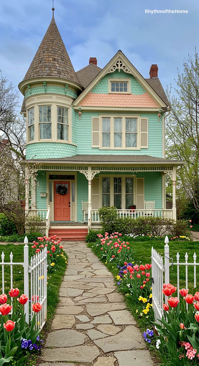 This sweet Victorian home is the essence of spring, with its cheerful pastel color palette and vibrant garden. The facade is a lovely mint green, with the gables and front door painted a complementary shade of soft coral. A classic white picket fence encloses the front yard, where a flagstone path leads to the steps. The path is bordered by a spectacular display of red, yellow, and purple tulips, creating a joyful and colorful welcome to this utterly charming and picturesque residence.