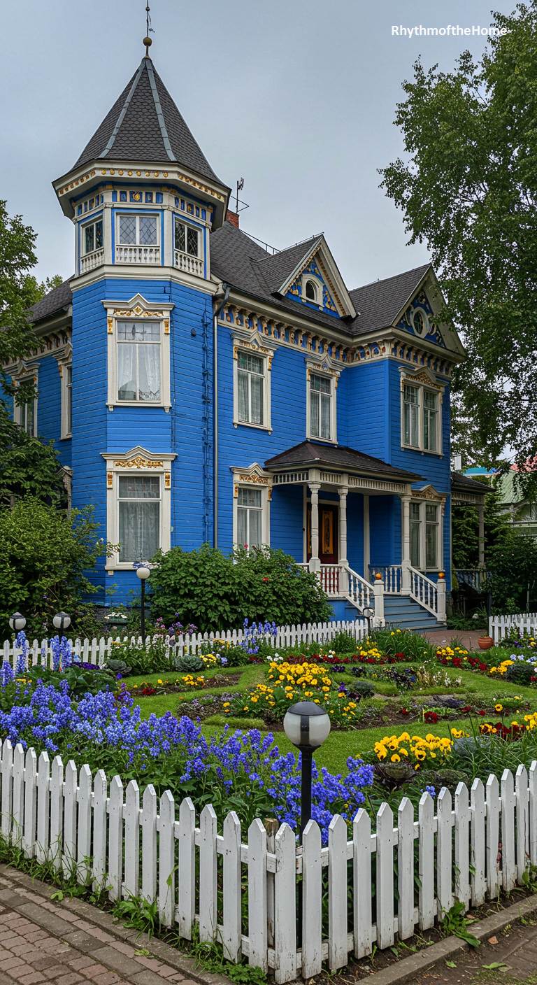 This stunning Victorian residence is a true architectural jewel. The facade is painted a deep and vibrant royal blue, which serves as a magnificent backdrop for the incredibly ornate trim, window surrounds, and porch details that are meticulously picked out in brilliant white and gleaming gold. The effect is lavish and exquisite, reminiscent of a Russian Fabergé egg or a fine lacquer box. A formal garden enclosed by a white picket fence completes the presentation of this precious and perfectly executed home.