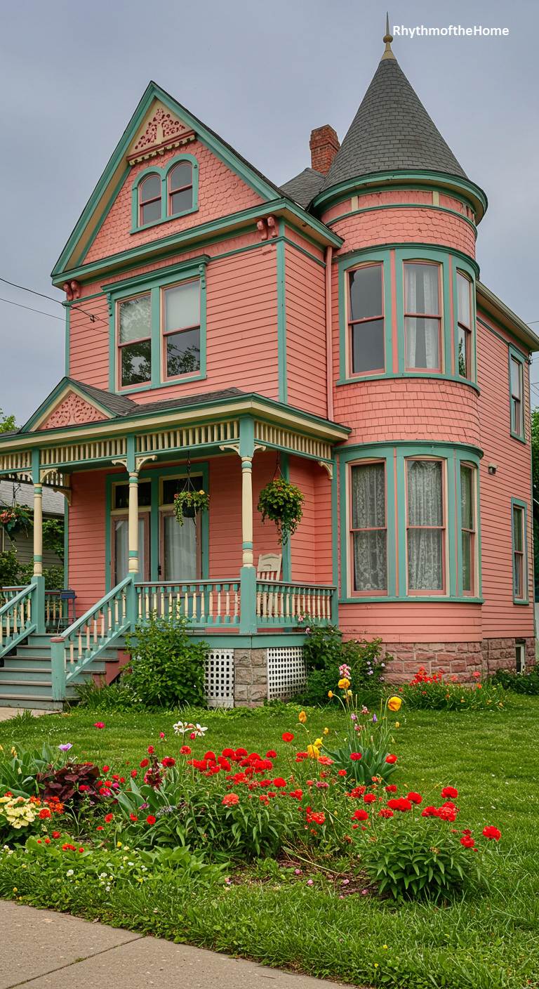 This classic Queen Anne Victorian home is a delightful example of playful color use. The facade is painted a cheerful salmon pink, a warm and inviting choice. Providing a cool and stylish contrast, the trim on the porch, windows, and decorative elements is a striking teal green. The house is set upon a rustic stone foundation, grounding the bright colors. A lush green lawn and a garden filled with a colorful mix of summer flowers complete this happy and beautifully presented home.