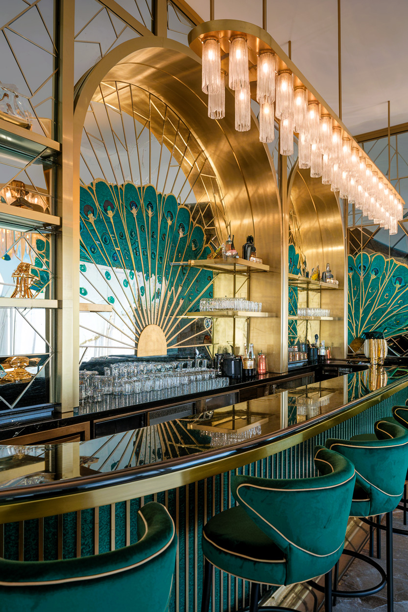 This stunning green and gold Art Deco-inspired bar is a masterful blend of glamour and drama, featuring a show-stopping curved brass archway adorned with cascading crystal pendant lights and magnificent turquoise peacock fan motifs that create an unforgettable focal point. The sophisticated color palette pairs rich metallic golds with deep jewel-toned turquoise, evident in both the statement wall design and the luxurious velvet bar stools with their elegant curved backs and gold piping. The black marble bar top reflects the ambient lighting beautifully, while the glass shelving and mirrored elements add depth and sparkle to this opulent space that perfectly captures the essence of modern luxury with vintage appeal.