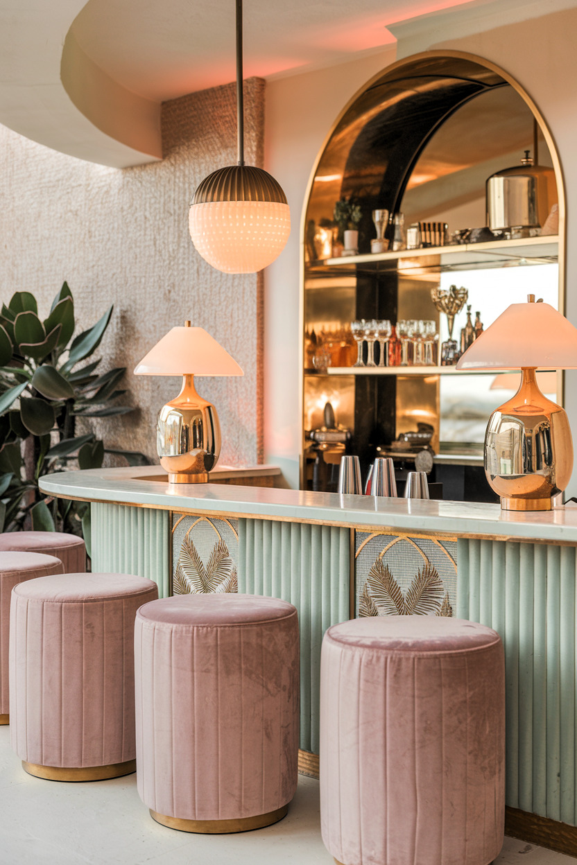 This sophisticated wet bar space embodies modern Palm Springs glamour with its soft mint-green fluted bar front, adorned with brass palm frond details that add an elegant tropical touch. The lighting scheme is masterfully curated, featuring chrome-based table lamps with cream shades and a complementary globe pendant, all casting a warm, flattering glow that’s enhanced by the arched mirror backdrop. The seating is both practical and luxurious with channel-tufted blush velvet poufs set on brass bases, while the textured ivory wall treatment and lush potted plants create a harmonious blend of 1950s sophistication and contemporary comfort.