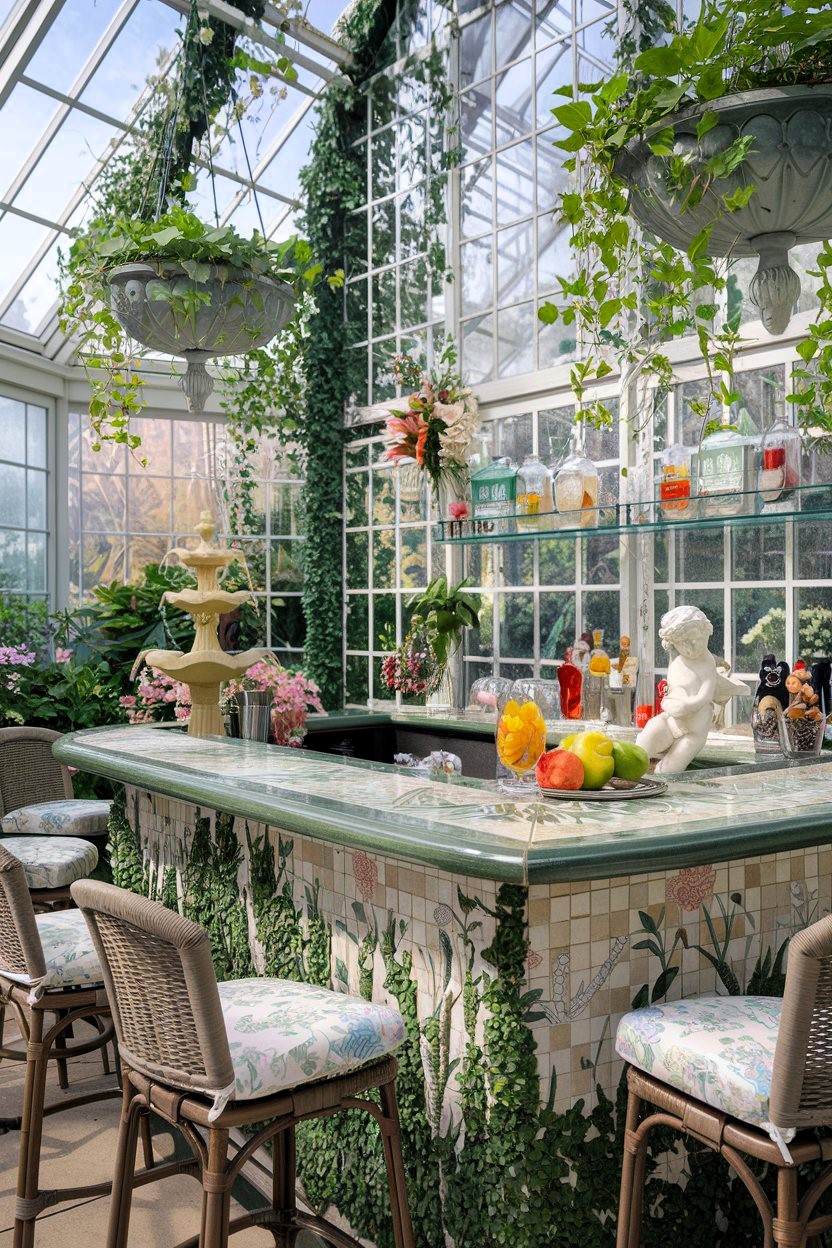 This enchanting greenhouse bar creates a magical garden sanctuary with its soaring glass ceiling, cascading ivy, and elegant stone urns filled with trailing plants that blur the line between indoor and outdoor spaces. The custom mosaic bar front features a delicate botanical pattern in soft greens and pinks, topped with a marble counter that perfectly complements the classical cherub statuary and vintage-inspired fountain feature. The seating is thoughtfully designed with French bistro-style rattan barstools upholstered in whimsical floral fabric, while the carefully curated bar display incorporates colorful citrus and fresh blooms to enhance the conservatory’s romantic, botanical atmosphere.