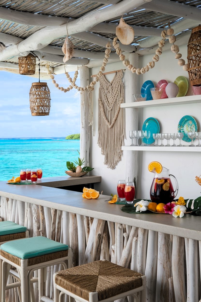 This breezy beachfront bar perfectly captures laid-back tropical luxury with its organic driftwood accent wall and woven rattan pendant lights that create a beautiful interplay of natural textures against crisp white walls. The concrete bar top provides a modern contrast while being softened by bohemian macramé wall hangings and whimsical shell garlands, complemented by pops of color from turquoise ceramic plates and vibrant tropical flowers. The seating area features casual yet chic white rattan barstools with seafoam green cushions, while the stunning ocean vista serves as nature’s artwork, creating an effortless indoor-outdoor flow that epitomizes barefoot elegance.