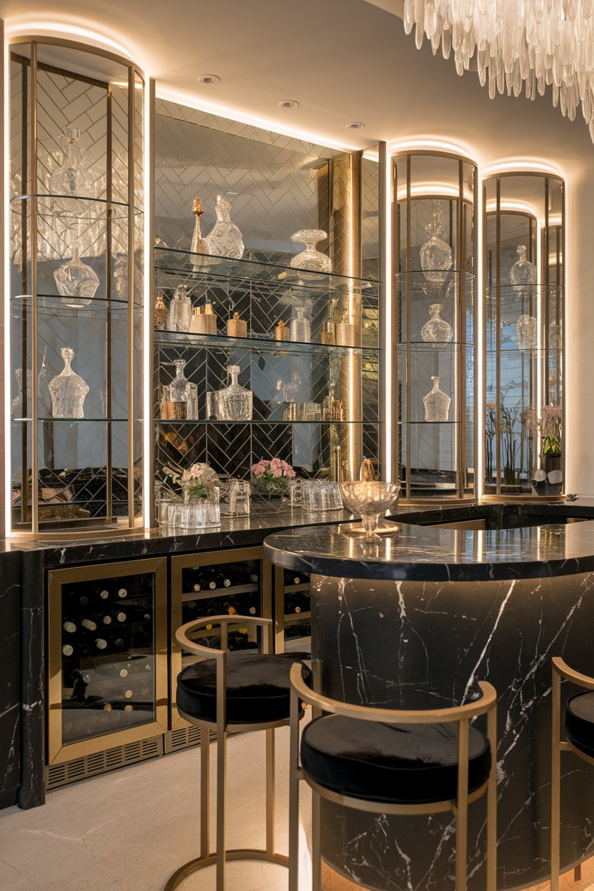 This sophisticated wet bar exemplifies modern luxury with its dramatic backdrop of herringbone mirrors framed by illuminated brass archways, creating an enchanting display for a stunning collection of crystal decanters and glassware. The noir marble countertops and base, veined with striking white striations, provide a bold contrast against the warm brass accents and built-in wine refrigeration units, perfectly balancing functionality with high-end design. The space is expertly finished with contemporary barrel-back bar stools in black velvet and brass, while strategic LED lighting throughout the arched displays creates an intimate atmosphere that elevates the entire entertainment experience.
