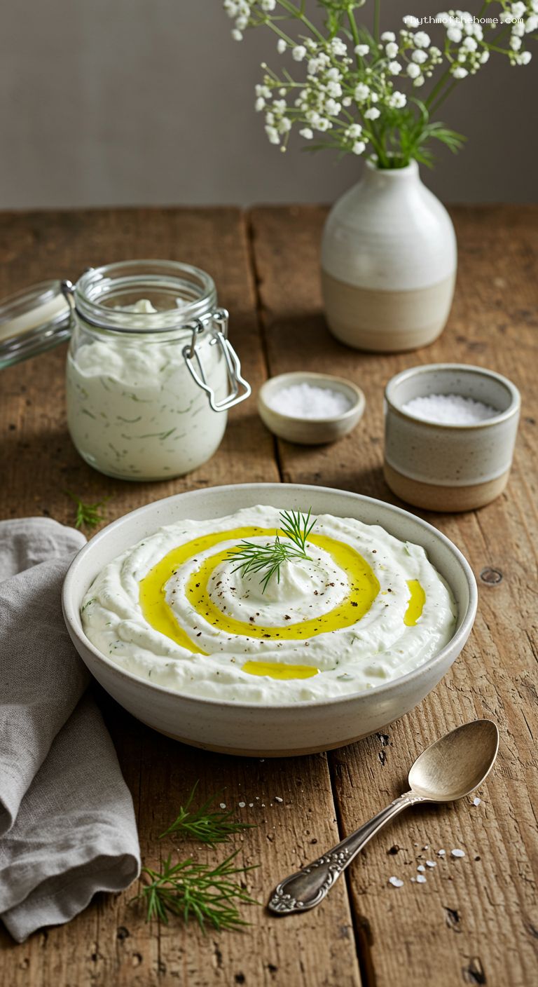 Before serving, give it a quick stir. Swirl the top with a spoon, drizzle with a thin ribbon of olive oil, and garnish with a pinch of lemon zest, extra dill, and a few grinds of black pepper. Serve chilled or cool.