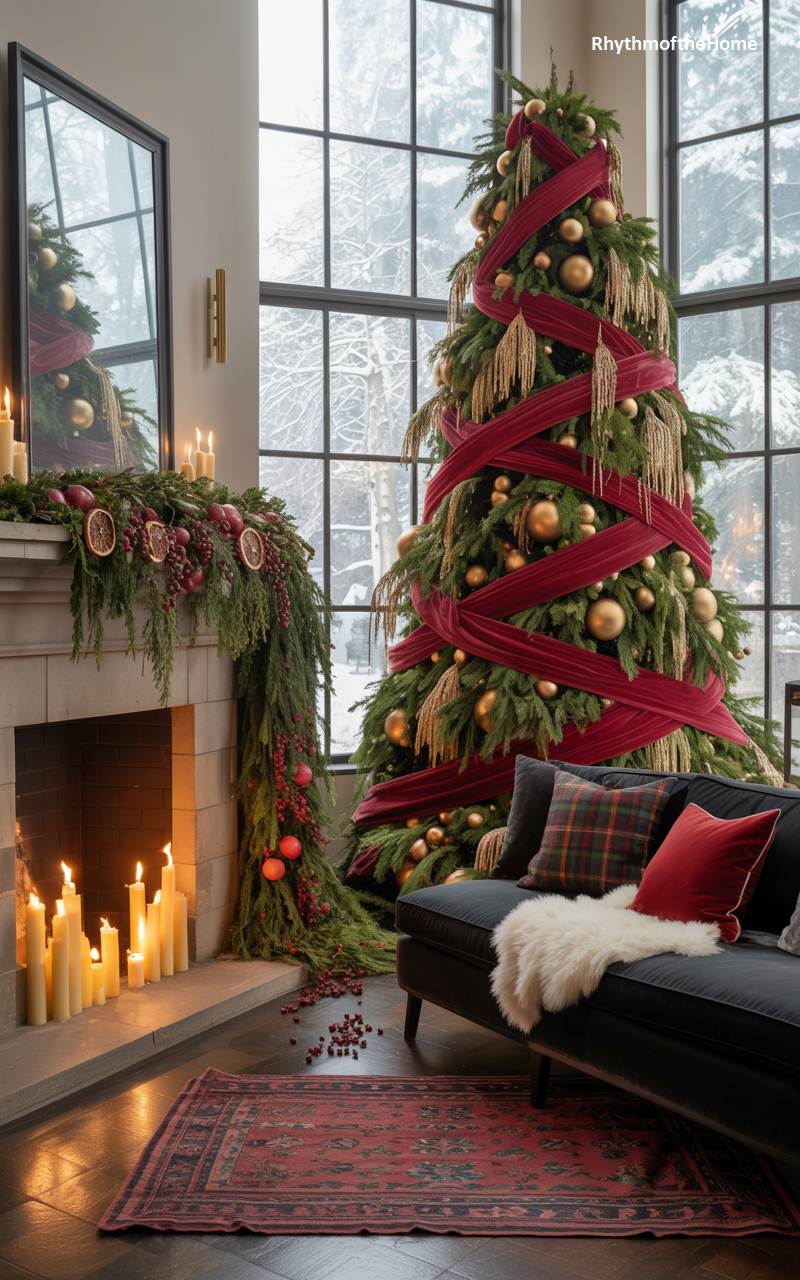 This living room offers a grand and inviting welcome to the winter season. The soaring Christmas tree, lavishly decorated with gold ornaments and a cascading red velvet ribbon, immediately captures the eye. A lush evergreen garland, adorned with dried citrus and red berries, drapes elegantly across the stone mantelpiece, mirroring the festive spirit. The warm glow from a multitude of candles in the hearth creates a cozy ambiance, beautifully contrasting with the serene, snow-covered landscape visible through the large, black-framed windows. It’s a perfect blend of opulent celebration and quiet winter beauty.