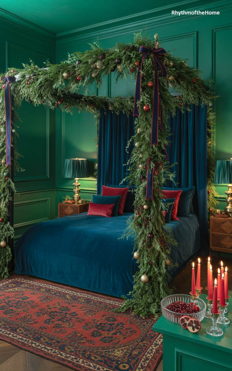 This bedroom offers a dramatic and enchanting escape, enveloped in a rich, jewel-toned emerald green. The four-poster bed is transformed into a magical forest bower, its frame lavishly draped in cascading garlands of fresh evergreens, accented with ornaments and trailing ribbons. The deep blue velvet duvet and pillows provide a luxurious and complementary color contrast, enhanced by pops of crimson. This bold and immersive design creates a theatrical and unforgettable sanctuary, a truly unique way to celebrate the winter season in style.