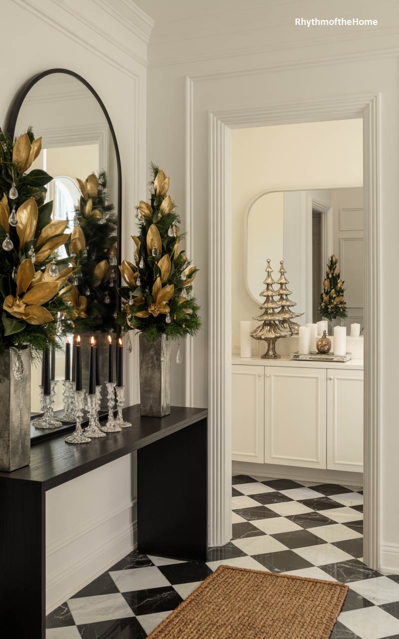 This chic hallway makes a bold and glamorous statement, setting a sophisticated tone for the rest of the home. The dramatic foundation is a classic, polished marble floor in a high-contrast black and white checkerboard pattern. A slim, minimalist black console table holds two elegant topiaries adorned with gilded magnolia leaves and sparkling crystal accents, which are beautifully reflected in the tall, arched mirror behind them. Through the doorway, a glimpse into an adjacent room reveals silver Christmas tree decorations, continuing the festive and polished winter theme.
