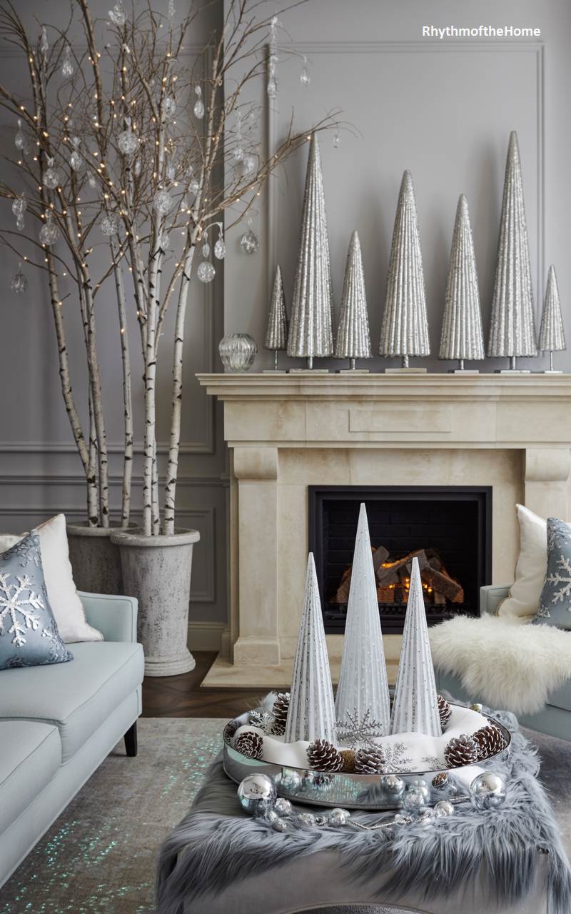 This living room presents a cool, calm, and collected take on contemporary winter style. The serene palette of soft grey, pale icy blue, and glistening silver creates a sophisticated and tranquil atmosphere. A modern “forest” of stylized, metallic cone-shaped trees in various sizes adorns the mantelpiece, their sleek forms adding a touch of minimalist glamour. In the corner, bare birch branches placed in a simple pot are delicately lit and hung with glass baubles, bringing an organic yet refined element to this elegantly frosty winter scene.