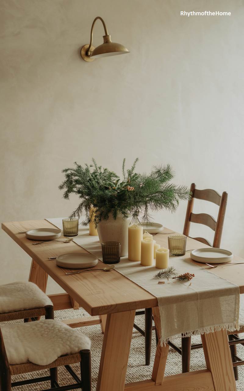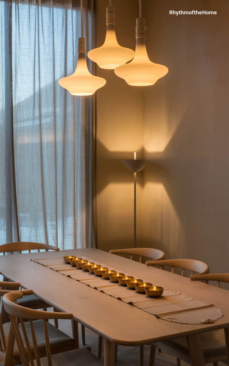 This dining space proves that winter coziness can be achieved with beautiful simplicity. The clean lines of the light oak dining table and chairs create a calm and uncluttered foundation, embodying a minimalist Scandinavian aesthetic. The magic lies in the lighting: three sculptural pendant lights cast a warm, ambient glow from above, while a simple line of small, lit candles in brass bowls runs down the center of a linen runner. This intimate and focused use of warm light transforms the minimalist room into an incredibly inviting and serene setting for a winter meal.