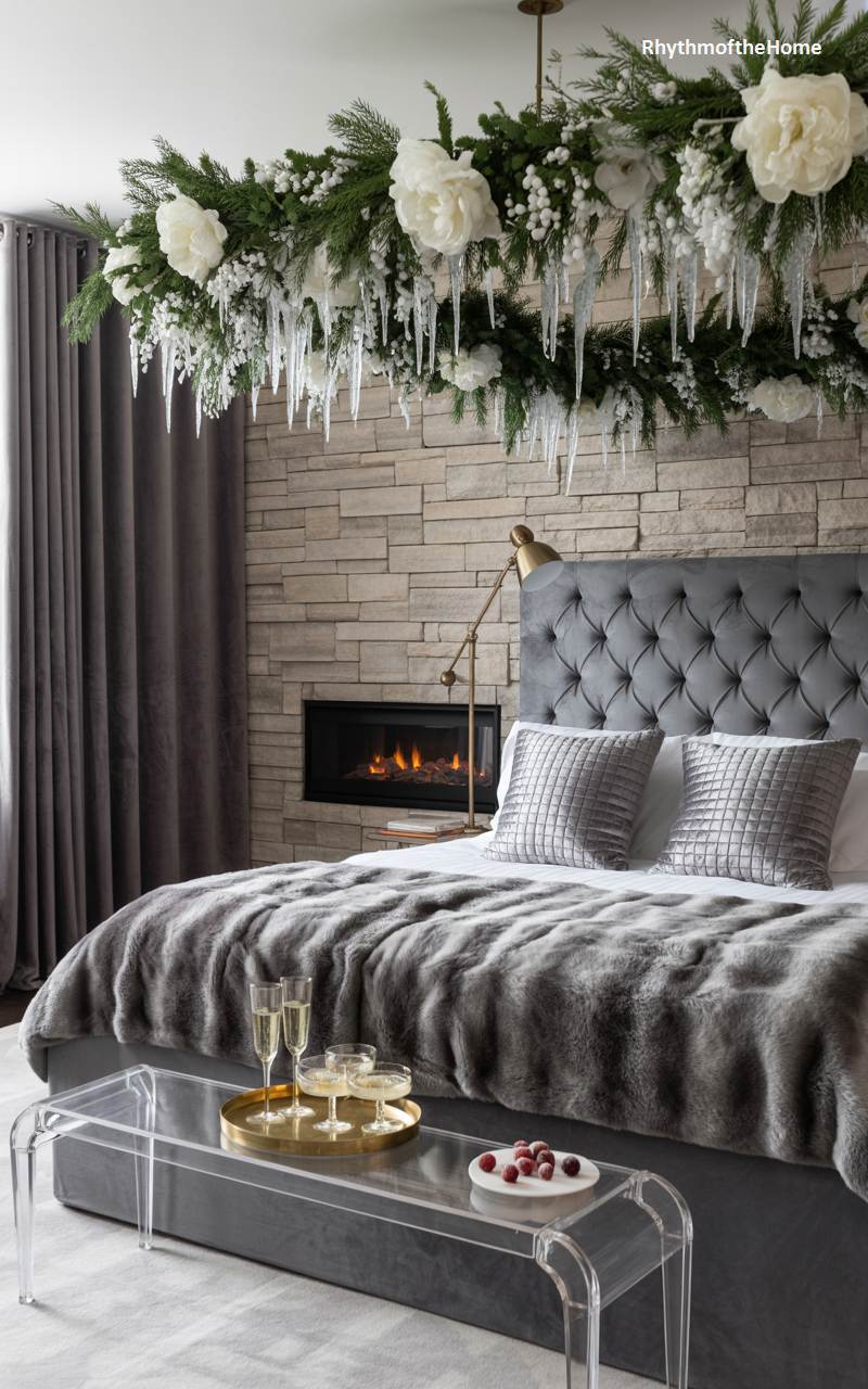 This bedroom is a stunning blend of rustic texture and glamorous winter fantasy. The undeniable showstopper is the custom chandelier suspended over the bed—a breathtaking creation of evergreen branches, lush white peonies, and sparkling crystal icicles that drip elegantly downwards. This juxtaposition of floral life and frozen beauty is utterly captivating. A plush grey faux fur throw adds a layer of luxurious warmth to the bed, while the stacked stone accent wall provides an earthy, textural contrast to the scene’s polished glamour, making for a truly unique winter retreat.
