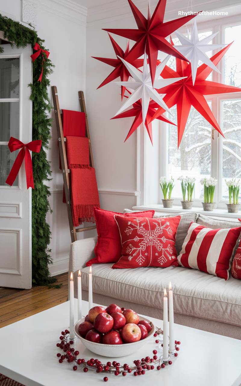 This living room is a joyful and vibrant celebration of Scandinavian winter design. Against a backdrop of clean white walls, the space is punctuated by cheerful pops of festive red. A cluster of large, geometric red and white paper stars hangs from the ceiling, creating a playful and eye-catching focal point. On the coffee table, a simple white bowl filled with crisp red apples and surrounded by candles adds a touch of natural color and warmth. The overall effect is bright, airy, and full of spirited charm, a perfect antidote to the dark winter days.
