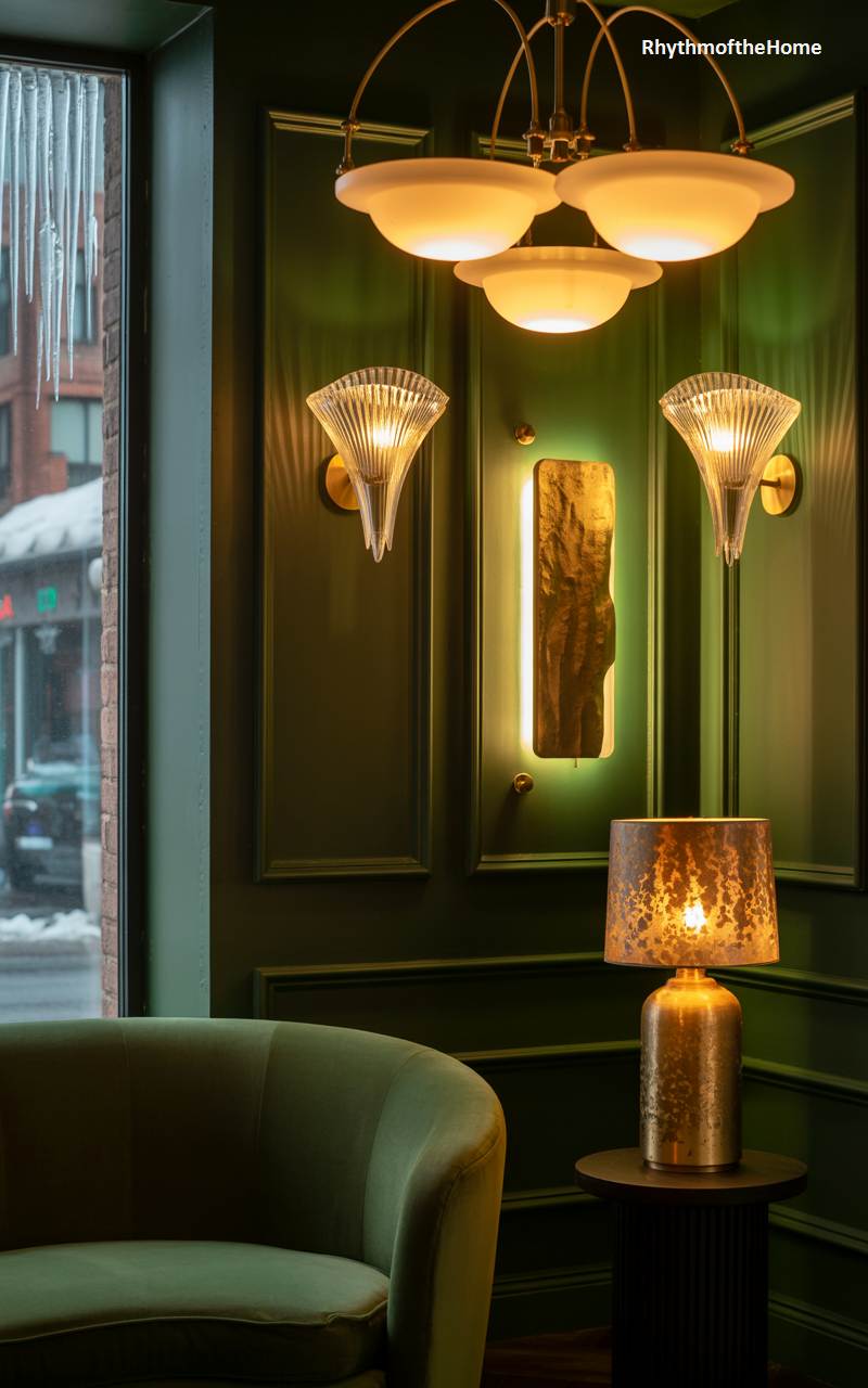This intimate corner exudes the sophisticated and moody ambiance of a vintage club on a cold winter night. The deep, forest green paneled walls create a rich, enveloping backdrop. A symphony of Art Deco-inspired light fixtures, from the fluted glass wall sconces to the elegant ceiling light, casts a warm, golden, and layered glow throughout the space. An olive green velvet armchair beckons one to sit and relax, while the view of icicles on the windowpane outside only enhances the feeling of being in a warm, stylish, and exclusive winter sanctuary.