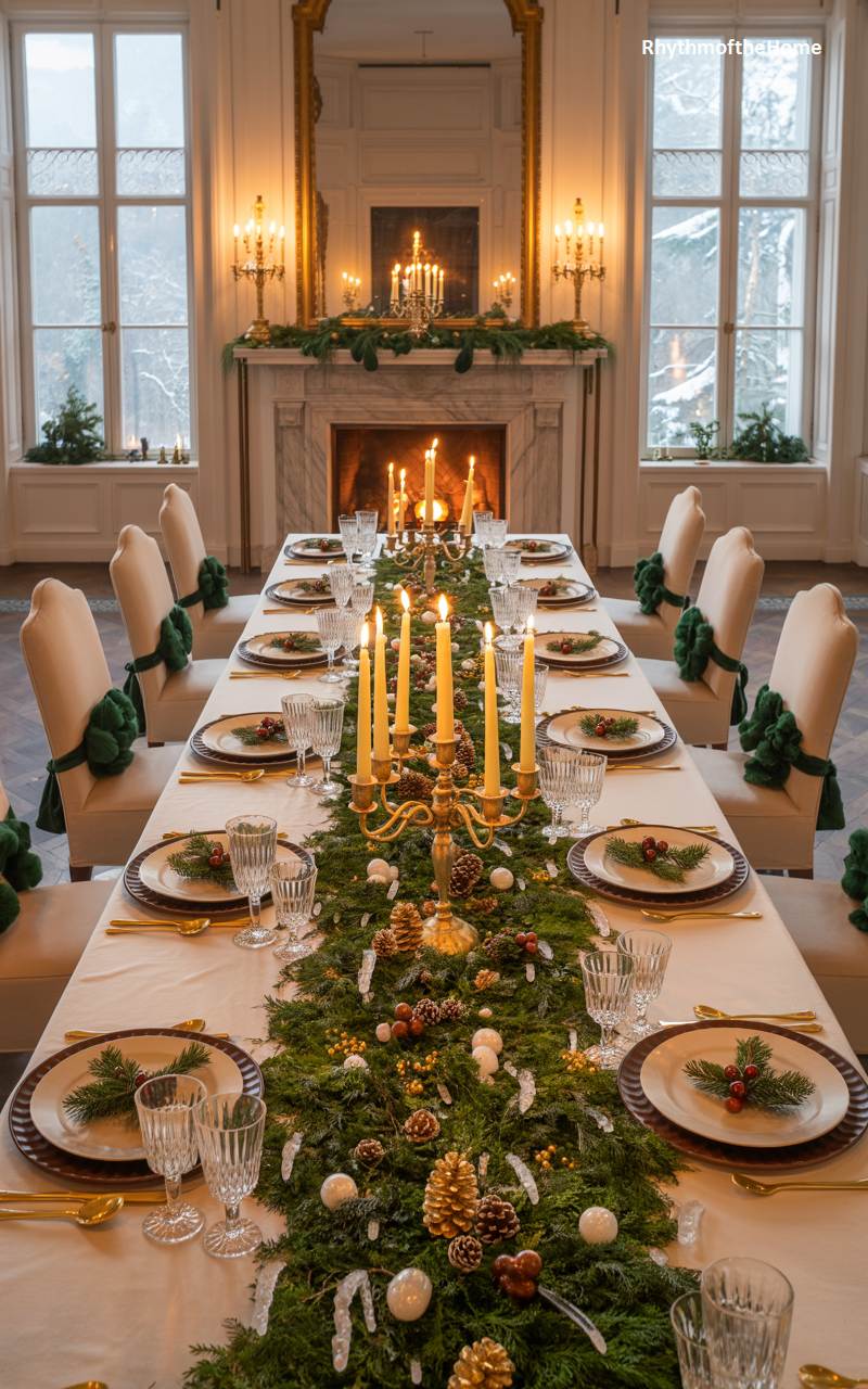 This magnificent dining room is set for a truly grand and memorable winter feast. The long, formal table is the star of the show, adorned with an incredibly lush and extravagant runner composed of various types of evergreen boughs, pinecones, berries, and other natural treasures. A procession of tall, elegant taper candles in ornate golden candelabras runs the length of the table, casting a dramatic and flattering light. The roaring fire in the stately fireplace in the background completes this picture of old-world elegance and opulent winter celebration.