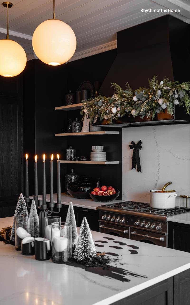 This kitchen demonstrates that holiday decor can be both festive and impeccably sleek. The dramatic backdrop of matte black cabinetry and a crisp white marble backsplash is the perfect canvas for sophisticated winter touches. A lush, modern garland featuring eucalyptus leaves and subtle white ornaments drapes gracefully across the minimalist range hood. On the expansive kitchen island, a curated collection of miniature frosted Christmas trees and tall, elegant black taper candles in a modern candelabra creates a stylish centerpiece that is refined, contemporary, and perfectly in the spirit of the season.