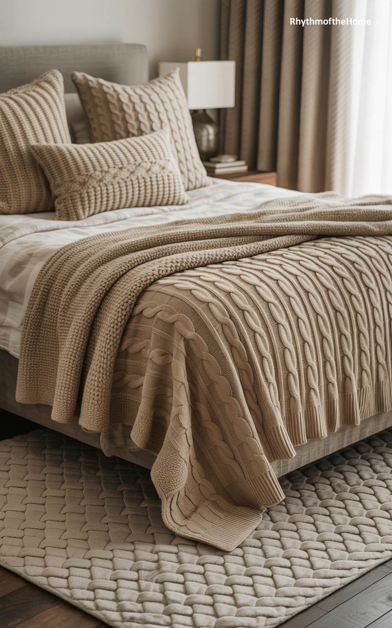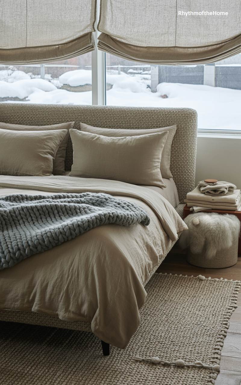 This bedroom is the absolute epitome of winter coziness, enveloped in layers of comforting, touchable textures. The bed is transformed into a sanctuary of warmth with a luxurious, chunky cable-knit throw blanket and an assortment of matching cabled and textured pillows. This tactile theme is continued with the thick, woven rug on the floor, adding another layer of softness underfoot. The soothing, monochromatic beige color palette enhances the tranquil and inviting atmosphere, creating the perfect retreat for snuggling up on a cold winter night.
