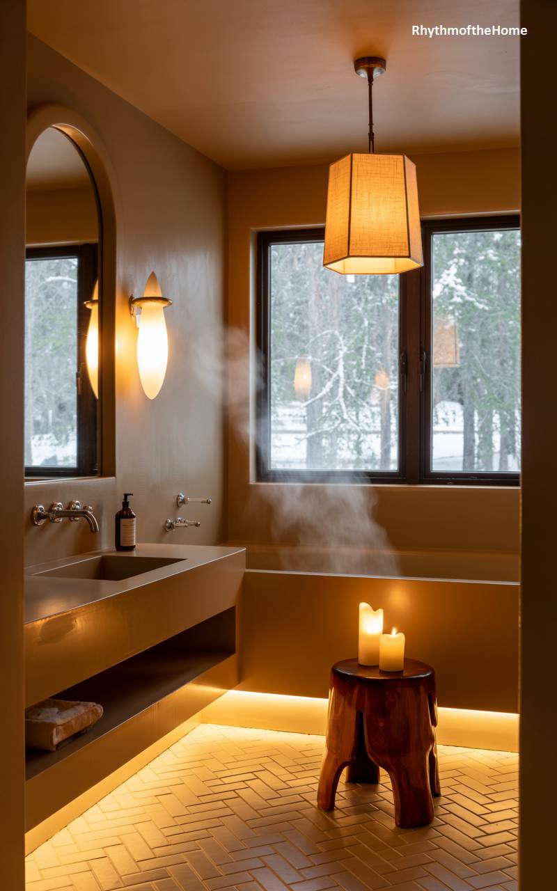 This bathroom is designed as the ultimate tranquil escape from the winter cold. The warm, earthy tones of the tadelakt-style plaster walls and the herringbone tile floor create a soothing, organic atmosphere that feels like a private spa. Wisps of steam rise from the bathtub, promising a deeply relaxing and restorative soak. The soft, flickering glow from two lit candles on a rustic wooden stool adds to the serene ambiance, while the large window provides a view of a snowy forest, enhancing the feeling of being safely cocooned in warmth and peace.