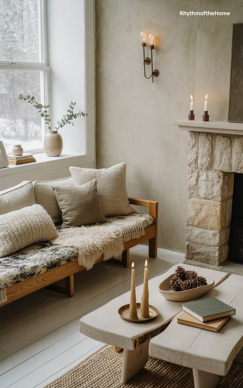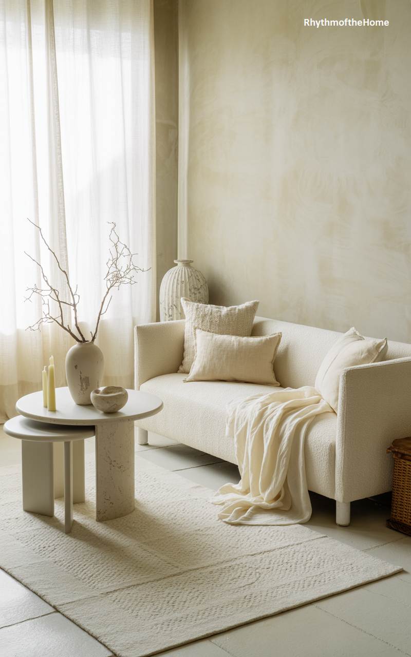 This living room is a masterful expression of serene, minimalist design, creating a peaceful haven for the winter months. The color palette is a soft and harmonious blend of whites, creams, and natural beiges, which fosters a light and airy feel. In this quiet space, texture takes center stage: a nubby bouclé sofa, a soft wool throw, a plush patterned rug, and plaster-finish walls all invite touch and add visual depth. A simple vase holding bare, sculptural branches on the side table is a subtle yet beautiful nod to the winter season outside.