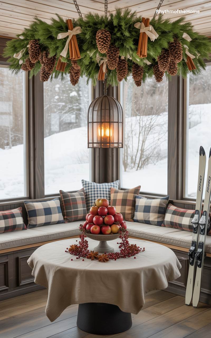 This charming breakfast nook is the epitome of a cozy winter hideaway, perfect for enjoying a hot cup of coffee on a snowy morning. A comfortable built-in banquette, piled high with plaid and textured pillows, invites you to linger. The undeniable showstopper is the incredible chandelier hanging above the table—a large ring of lush greenery, generously adorned with huge pinecones, cinnamon stick bundles, and white ribbons. A pedestal bowl filled with bright red apples provides a rustic and colorful centerpiece, completing this picture-perfect and festive country corner.