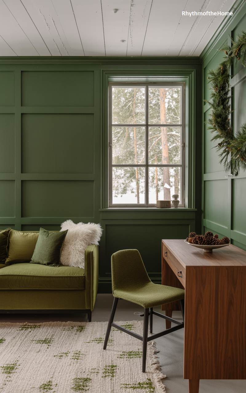 This handsome study feels like a cozy retreat nestled deep within a winter forest, thanks to its immersive olive-green walls with classic paneling. The rich color creates a calm and focused atmosphere, ideal for work or quiet contemplation. An olive velvet sofa and a simple, modern wooden desk provide comfortable and stylish furnishings. A simple evergreen wreath adds a touch of seasonal greenery, while the large, multi-paned window perfectly frames a tranquil view of snow-dusted pine trees, effectively bringing the serene beauty of the winter landscape indoors.