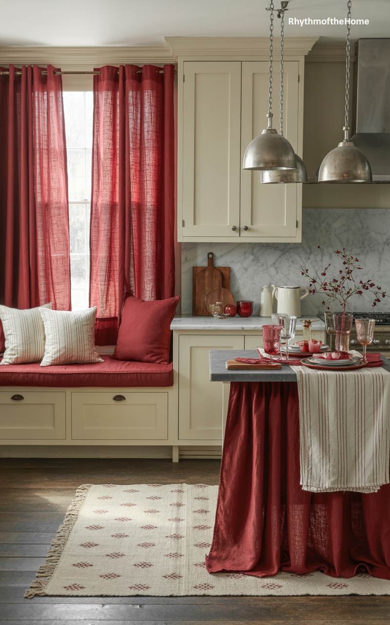This bright and inviting kitchen is infused with a cheerful winter spirit through the strategic use of festive red. Rich, textured red linen curtains frame the window, drawing the eye and adding a bold splash of color. Matching red cushions on the built-in window seat create a cozy spot to sit. The kitchen island, cleverly draped with a red linen skirt, is set for a casual meal with coordinating red glassware. The creamy off-white cabinetry and marble backsplash provide a light and airy counterpoint, perfectly balancing the vibrant accents.
