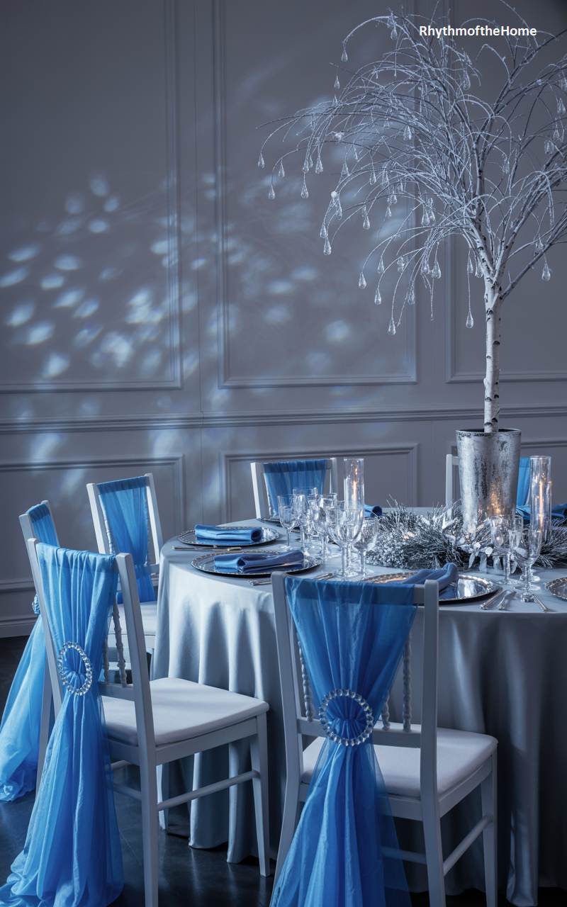 This dining table is set for an enchanting and elegant winter affair, evoking the magic of a frozen fairytale. The color palette is a cool and sophisticated mix of shimmering silver and ethereal icy blue. A stunning centerpiece featuring a silver-painted birch tree branch, dripping with delicate crystals, conjures images of a sparkling, ice-laden forest. The chairs are adorned with sheer blue sashes, cinched with glamorous rhinestone buckles. The entire scene is bathed in a soft, cool light that enhances the shimmering, otherworldly quality of this beautiful winter tablescape.