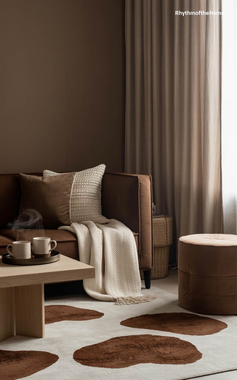 This living room is a cozy cocoon, enveloped in a rich and comforting palette of warm browns and soft creams. A deep brown leather sofa, softened by a cream-colored knit throw and a textured pillow, serves as the inviting centerpiece. The area rug features a bold, organic pattern in coordinating shades of brown and white, grounding the space. On the light wood coffee table, a tray holding two steaming mugs hints at a shared, quiet moment, completing a scene of earthy elegance perfect for hibernating on a chilly winter day.