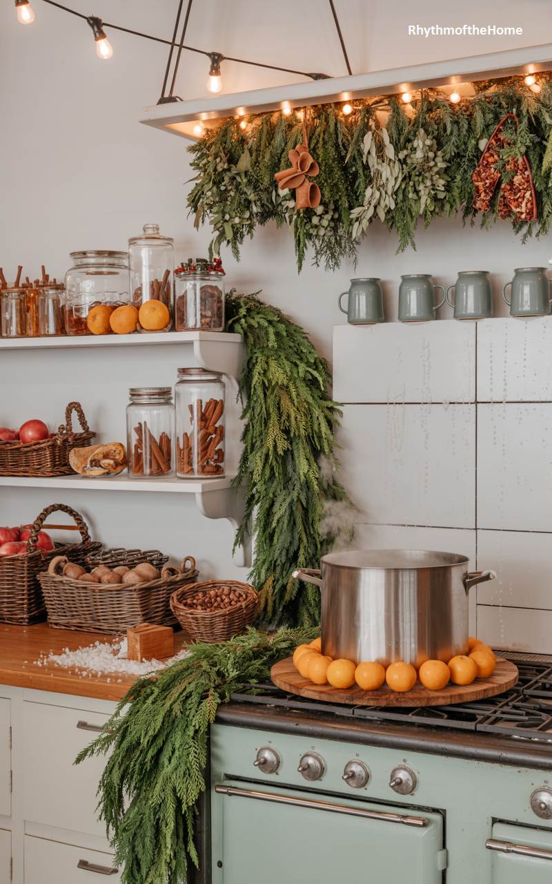 This kitchen scene is alive with the sensory delights of a bustling winter homestead. A large stainless steel pot steams away on the vintage mint-green stove, suggesting a fragrant soup or mulled cider is being prepared. Lush, abundant garlands of fresh cedar and other evergreens drape from the open shelving and cascade down the countertop, filling the space with their crisp, natural perfume. Baskets of apples and nuts, along with large glass jars filled with cinnamon sticks, complete this picture of rustic, homespun comfort and winter abundance.