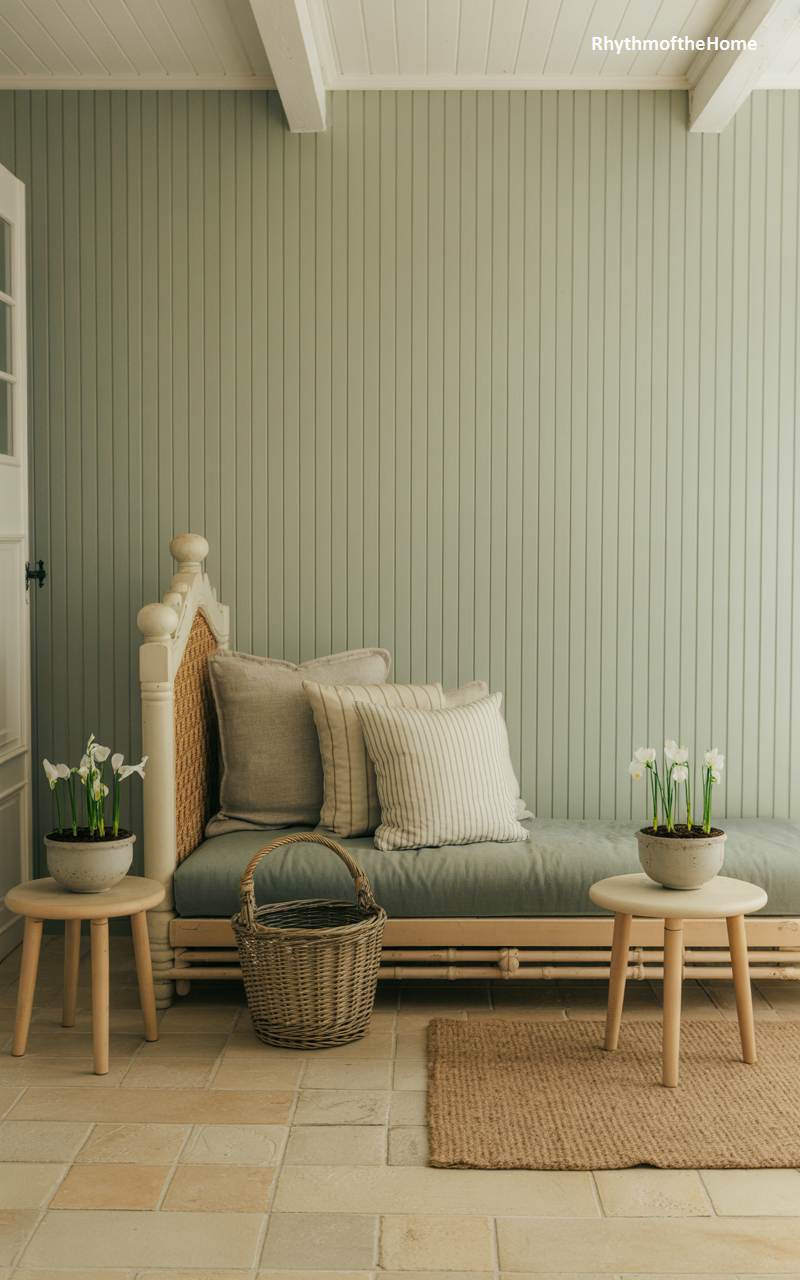This light-filled sunroom offers a refreshing and serene take on winter decor, providing a welcome connection to nature during the colder months. The walls are painted a soft and calming sage green, creating a peaceful atmosphere. A simple wooden daybed with neutral-toned linen pillows offers a comfortable place to lounge and soak up the winter sun. Bringing a touch of life and a promise of spring, two small pots of blooming white narcissus flowers sit on side tables, their delicate blossoms a beautiful contrast to the winter scenery outside.
