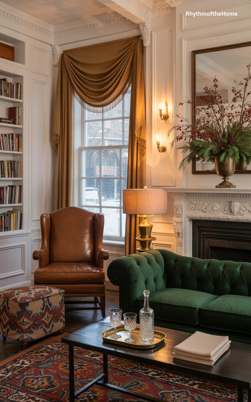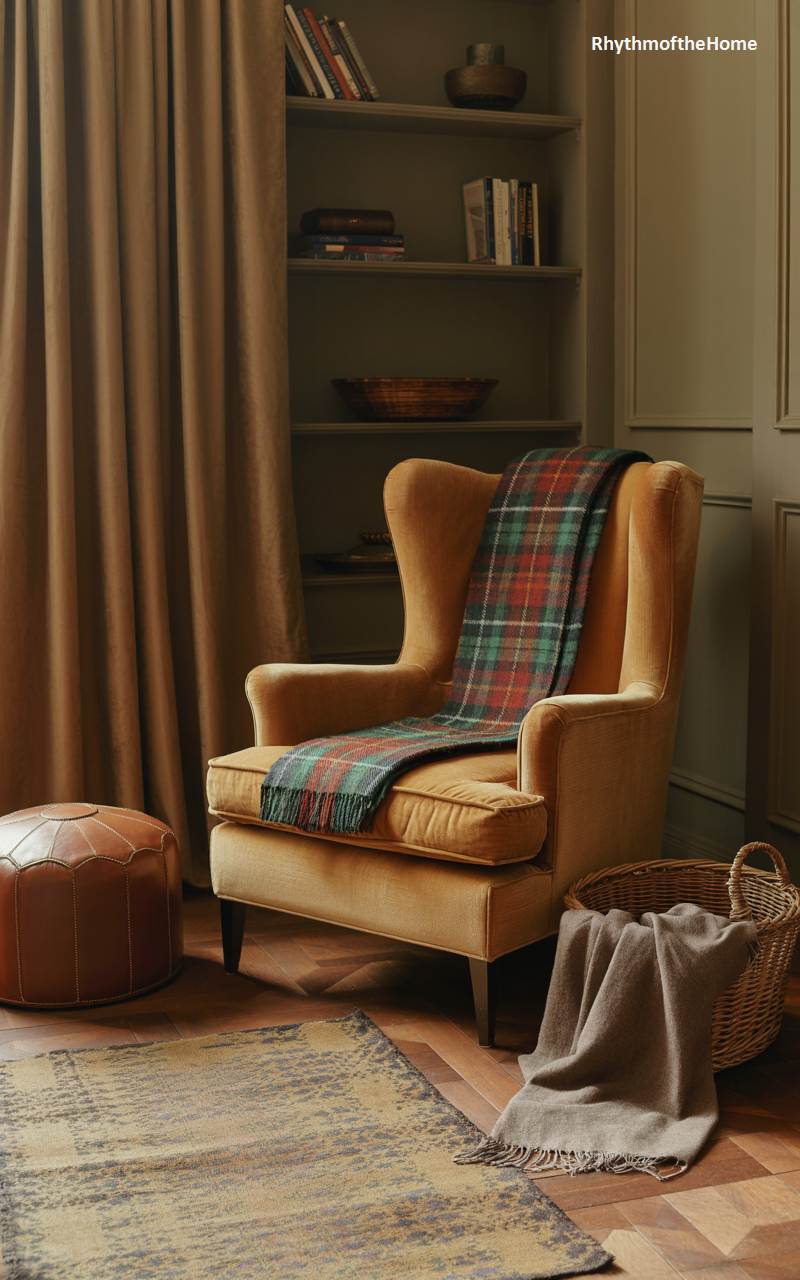 This cozy corner is the quintessential retreat for a winter afternoon spent with a good book. The rich, mustard-yellow velvet of the classic wingback chair provides a warm and inviting focal point against the muted olive-green walls and built-in bookshelves. A traditional red and green plaid throw offers an extra layer of comfort and a nod to timeless seasonal style. The ensemble, complete with a leather pouf and heavy drapes, crafts an intimate and studious atmosphere, perfect for escaping the world and getting lost in literature on a chilly day.