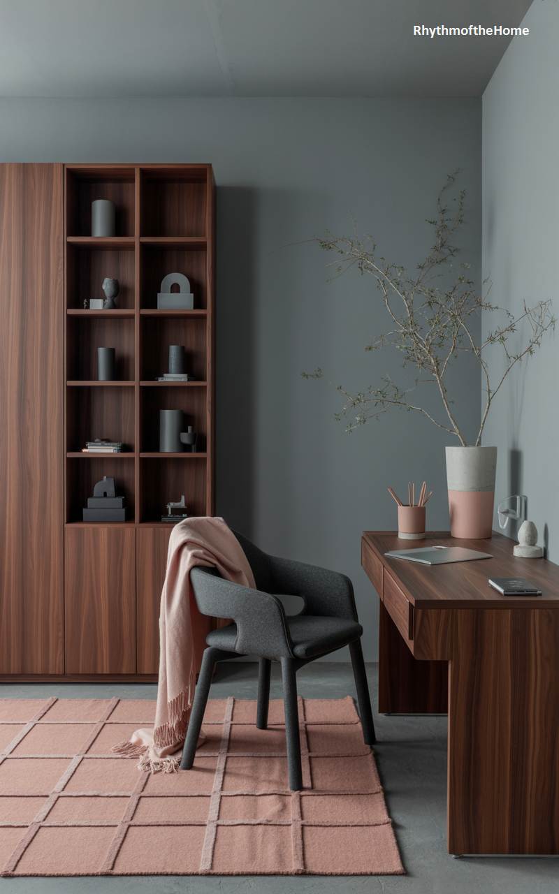 This stylish home office proves that a workspace can be both functional and cozy, blending sleek modern design with soft winter textures. The warm wood of the minimalist desk and shelving unit provides a beautiful organic contrast to the cool, sophisticated gray walls. A surprising and elegant touch of color is introduced through a dusty rose-colored rug and a matching soft throw blanket draped casually over the charcoal gray chair. A simple vase containing bare branches adds a final, sculptural nod to the winter season.