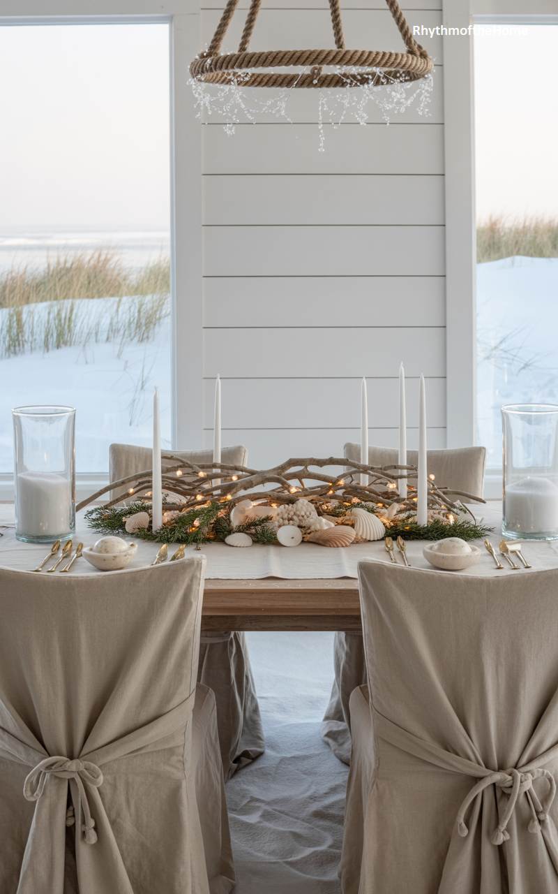 This unique dining room beautifully marries a breezy coastal aesthetic with a cozy winter mood. Through the large windows, a serene view of a snow-covered beach creates a stunning and tranquil backdrop. The dining table is set with an imaginative centerpiece that blends the seasons: pieces of weathered driftwood and a collection of seashells are artfully combined with sprigs of evergreen and the magical twinkle of fairy lights. The casual linen slipcovered chairs and neutral tones maintain a relaxed, beach-house vibe that feels perfectly serene even in winter.