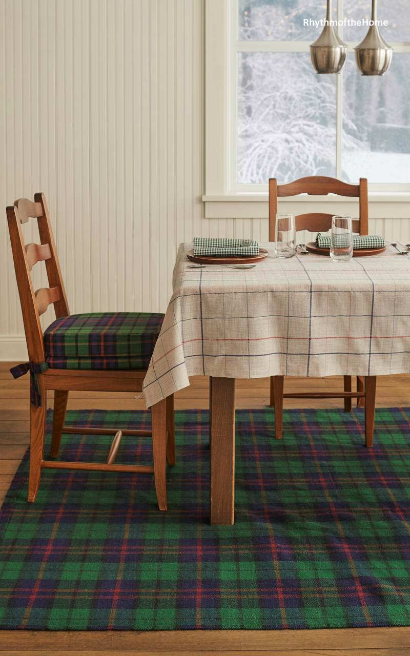 This simple yet charming dining scene is a heartfelt tribute to the timeless comfort of winter plaid. A large area rug in a classic green and blue Black Watch tartan pattern anchors the space and sets a cozy, traditional tone. This is echoed by the matching plaid cushion tied to one of the simple, Shaker-style wooden chairs. The tablecloth features a more subtle, complementary plaid, creating a pleasing, layered effect. This unpretentious setting evokes the warm, familiar feeling of a traditional home during the winter season.