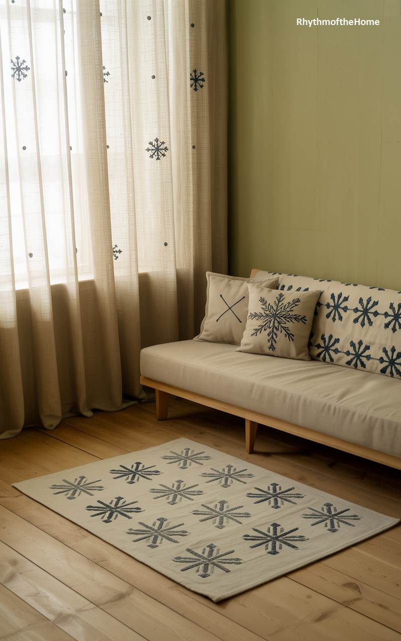 This living room playfully and elegantly embraces a snowflake motif to celebrate the winter season. The large window is dressed in sheer, lightweight curtains beautifully embroidered with a pattern of delicate falling snowflakes, allowing them to catch the light. On the minimalist, light-wood sofa, a collection of cushions features larger, bolder snowflake designs, creating a cohesive theme. A matching area rug underfoot completes the look, resulting in a space that feels light, whimsical, and full of modern Scandinavian charm.