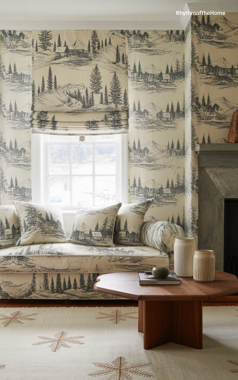 This enchanting nook is completely enveloped in a classic black and white toile de Jouy fabric, creating a charming and immersive experience. The delightful pattern, which depicts a rustic winter landscape scene, adorns the walls, the Roman shade, and all the cushions on the cozy built-in window seat. This maximalist, pattern-on-pattern approach results in a room that feels traditional, sophisticated, and incredibly cozy, almost like stepping directly into the pages of a beautifully illustrated vintage storybook about a winter’s tale.