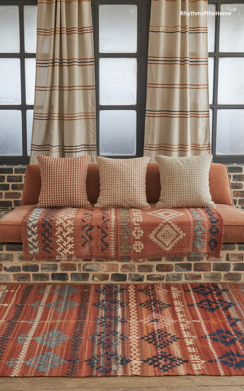 This inviting seating area showcases a warm, eclectic, and bohemian approach to winter styling. Set against a rustic exposed brick wall, an orange-cushioned daybed is layered with an array of globally-inspired textiles, including a richly patterned throw and mismatched pillows. The warm tones are continued in the striped curtains and the vibrant, Kilim-style area rug, which adds another layer of intricate pattern and texture. The overall look is free-spirited, full of personality, and deeply comforting, a perfect fusion of worldly design and cozy winter hygge.