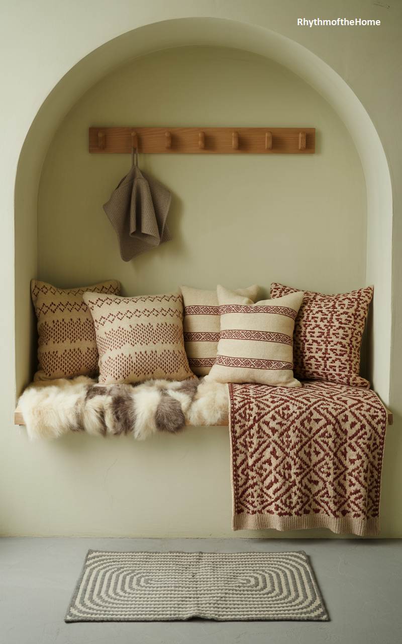 This beautifully designed arched nook is a perfect example of functional and cozy Scandinavian style. A simple wooden bench is transformed into a comfortable seat with the addition of a soft sheepskin throw. A curated collection of pillows and a folded blanket, featuring a classic red and cream Nordic geometric pattern, add a touch of festive color and inviting texture. A simple wooden peg rack above provides practical storage for hanging towels or clothes, making clever and stylish use of a small space to create a welcoming winter feature.