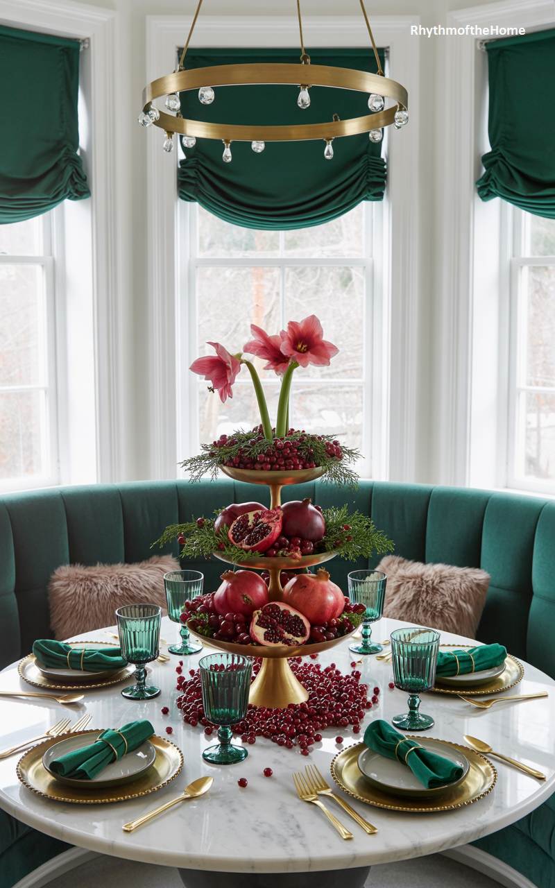 This stunning dining table is set for a lavish winter celebration, presenting a true feast for the eyes. A dramatic, multi-tiered brass stand serves as the magnificent centerpiece, overflowing with the rich, jewel-toned colors of the season: deep red pomegranates, some cut open to reveal their glittering seeds, lush evergreen foliage, and the elegant blooms of pink amaryllis. The deep emerald green of the velvet banquette seating and matching napkins provides a luxurious complement, while gold cutlery adds a final touch of glamour to this opulent tablescape.