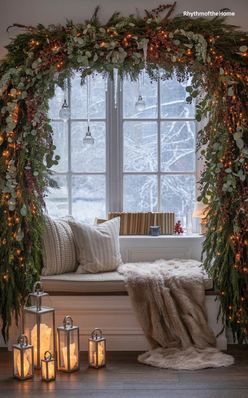 This window seat is transformed into an utterly enchanting and magical winter reading spot. The window itself is framed by a magnificent, arching garland of evergreens, eucalyptus, and red berries, all twinkling with the warm glow of fairy lights. Delicate glass icicle ornaments hang down from the garland, adding a touch of frosty magic. The seat is made irresistibly cozy with a plush faux fur blanket and soft knit pillows, while lanterns filled with glowing crystals on the floor complete this dreamy and picturesque winter vignette.