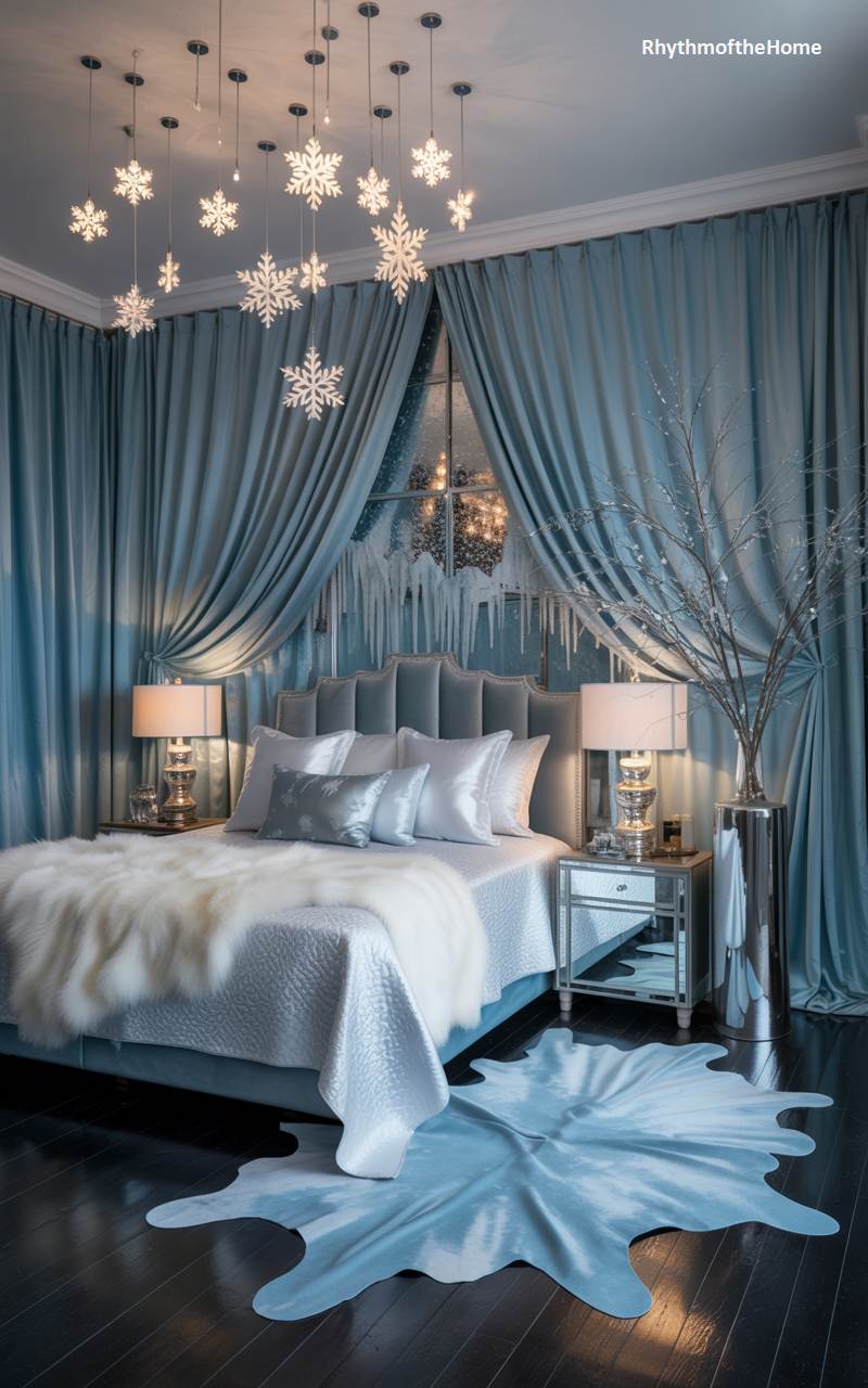 This bedroom has been transformed into a magical and glamorous winter wonderland. The color scheme is a sophisticated symphony of icy blues, crisp whites, and shimmering silvers, evoking the feeling of a frost-kissed fairytale. A constellation of illuminated snowflake pendants hangs from the ceiling, casting a dreamy glow over the space. The bed, with its plush velvet headboard and satin pillows, is draped in a luxurious white faux fur throw. Mirrored nightstands and a silver vase of frosted branches amplify the glistening, ethereal ambiance of this enchanting winter dream.