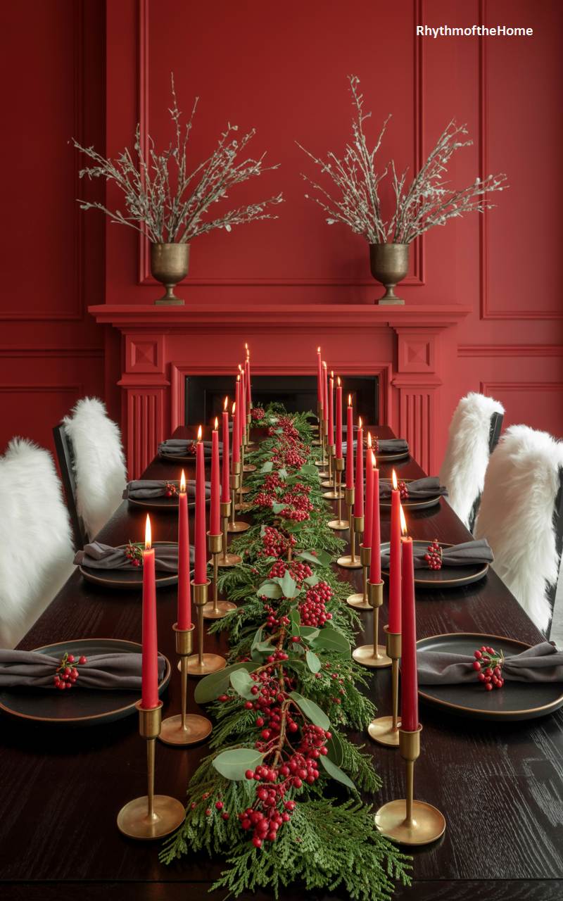 This dining room makes a powerful and sophisticated statement, wrapped in a deep, dramatic red. The bold wall color creates an intimate and festive atmosphere, perfect for a special winter gathering. The long, dark wood table is adorned with a simple yet highly effective centerpiece: a lush runner of fresh greenery and vibrant red berries, punctuated by a procession of tall, elegant red taper candles in minimalist brass holders. Soft, fluffy white throws draped over the black chairs provide a striking textural and color contrast, completing this passionate and memorable setting.