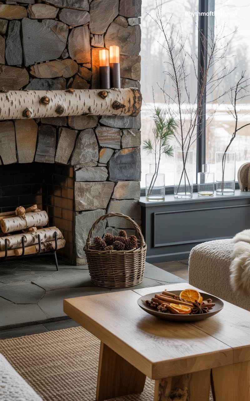This scene celebrates the quiet, understated beauty of a natural winter aesthetic. The focal point is a magnificent rustic fireplace, constructed from large, irregular fieldstones and featuring a unique mantel made from a whole birch log. Instead of traditional decorations, the focus is on organic textures and scents. On the simple wooden coffee table, a ceramic bowl holds a fragrant mix of cinnamon sticks, star anise, and dried orange slices. Bare branches in clear glass vases by the window echo the stark beauty of the winter landscape outside.