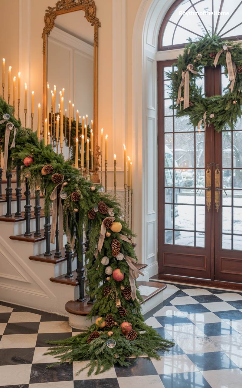 This magnificent foyer offers a breathtaking first impression, decorated for the season with timeless grandeur. A thick, exceptionally lush garland of mixed evergreens cascades dramatically down the banister of the sweeping staircase, generously studded with pinecones, golden baubles, and festive red apples. An impressive array of tall, lit taper candles lines the railing, casting a warm and dramatic glow over the scene. The classic elegance is further enhanced by the polished black and white checkered marble floor, creating a truly memorable and festive winter welcome.