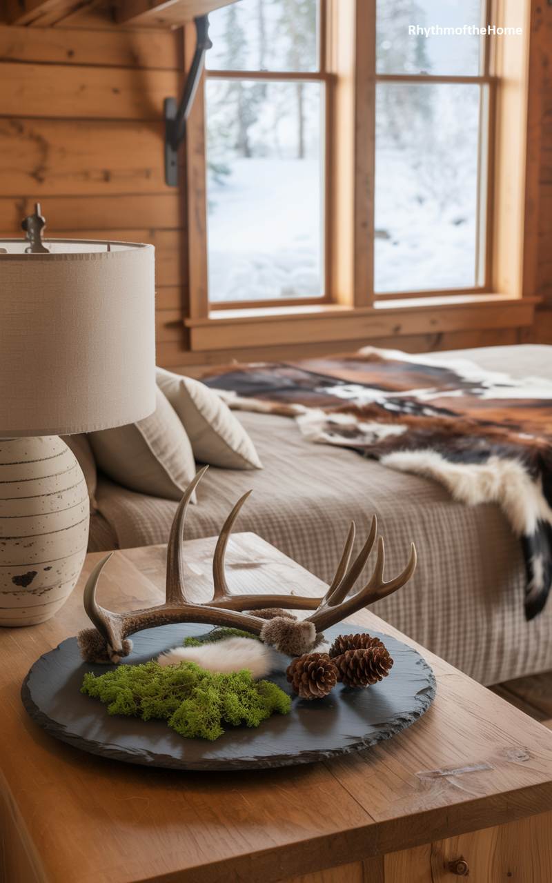 This bedroom, located within a log cabin, perfectly captures the essence of a rustic winter lodge. The decor emphasizes natural materials and brings the outdoors in. On the chunky wooden nightstand, a simple slate platter serves as a base for a compelling natural display: a shed deer antler, vibrant green moss, and a pair of pinecones. The bed is simply dressed with a waffle-weave blanket and a plush animal hide throw. The view of the snowy woods through the window completes this immersive and cozy cabin experience.