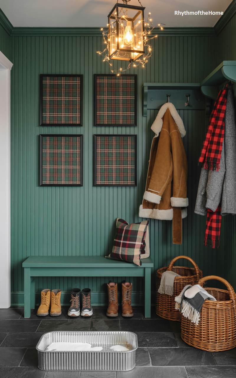 This handsome mudroom is a masterclass in combining style and practicality for the winter season. The walls, clad in a deep green vertical beadboard, create a rich and classic backdrop. As a creative touch, four framed squares of plaid fabric add pattern and a cozy, textural element. A warm shearling-lined coat and a classic red plaid scarf hang at the ready. Wicker baskets for accessories and a boot tray on the slate floor ensure that all the gear of winter has a tidy and organized home.