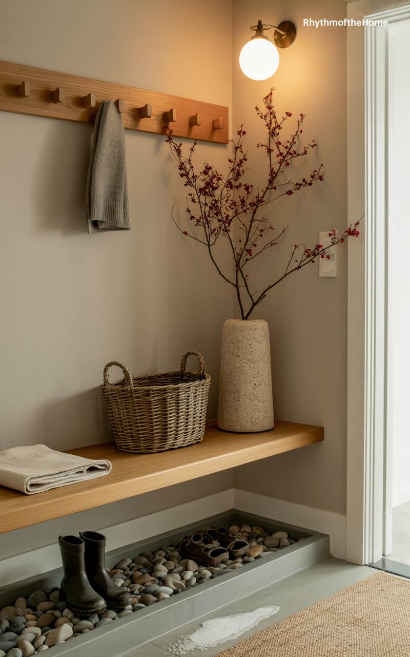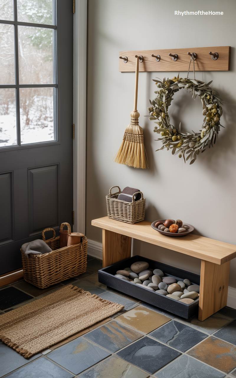 This entryway embodies a clean, functional, and nature-inspired design philosophy, perfect for maintaining a sense of calm during the winter months. A minimalist light wood bench provides a place to sit and remove shoes. Below it, a shallow black tray filled with smooth, gray river stones offers a stylish and practical solution for wet and snowy boots, allowing them to drain and dry neatly. A simple wreath made of preserved olive branches hanging from a peg rail adds a touch of soft, silvery-greenery, completing the serene and organized aesthetic.