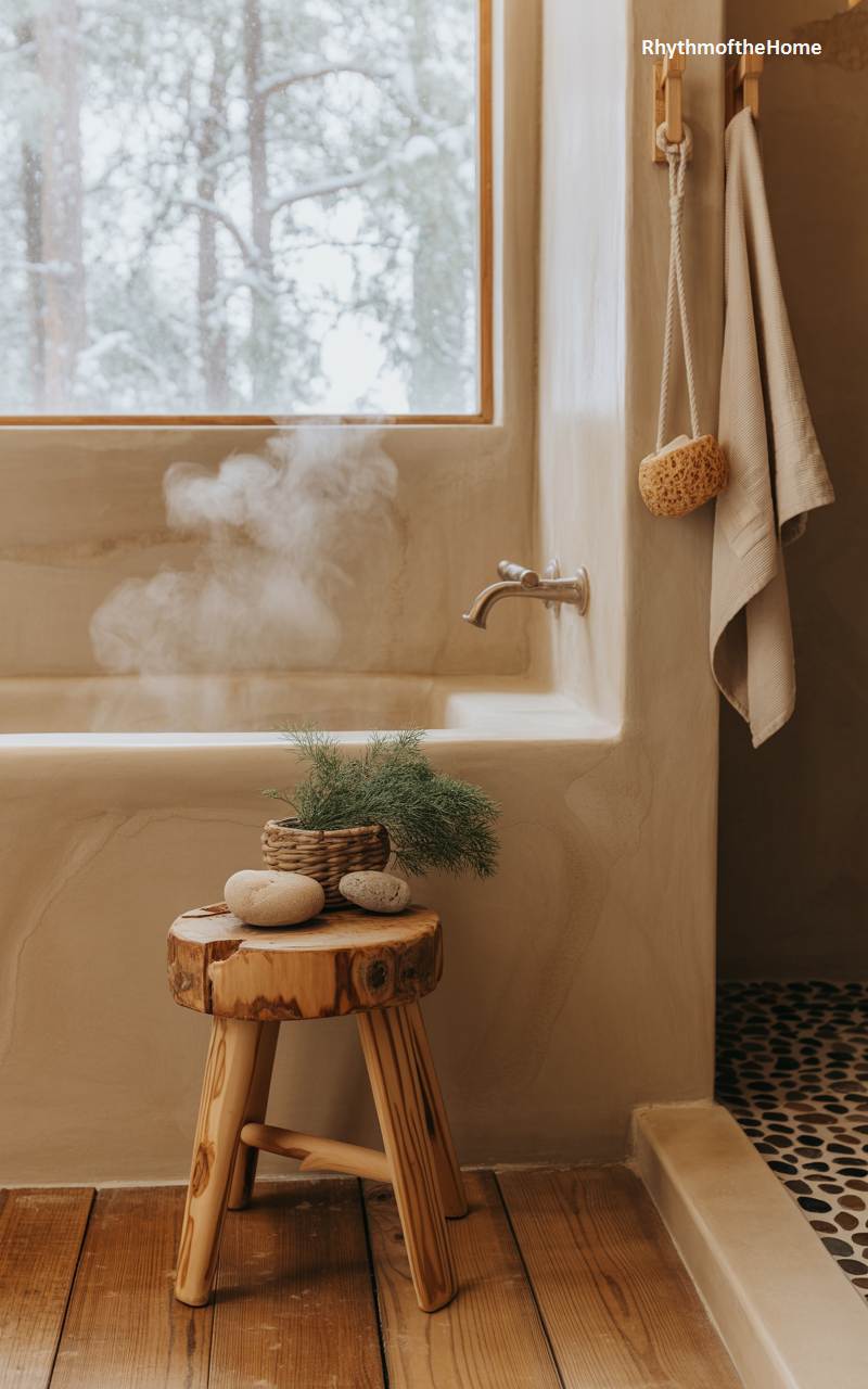 This bathroom is a serene, spa-like haven, designed as a tranquil escape from the winter chill. The walls feature a soft, warm-toned plaster finish, and the shower floor is a mosaic of smooth river pebbles, creating an organic and earthy feel. Inviting wisps of steam rise from the deep soaking tub, promising a restorative experience. A small, rustic wooden stool beside the tub holds a woven planter with fresh greenery, adding a touch of life. The large window provides a view of the snowy outdoors, heightening the sense of warmth and sanctuary within.