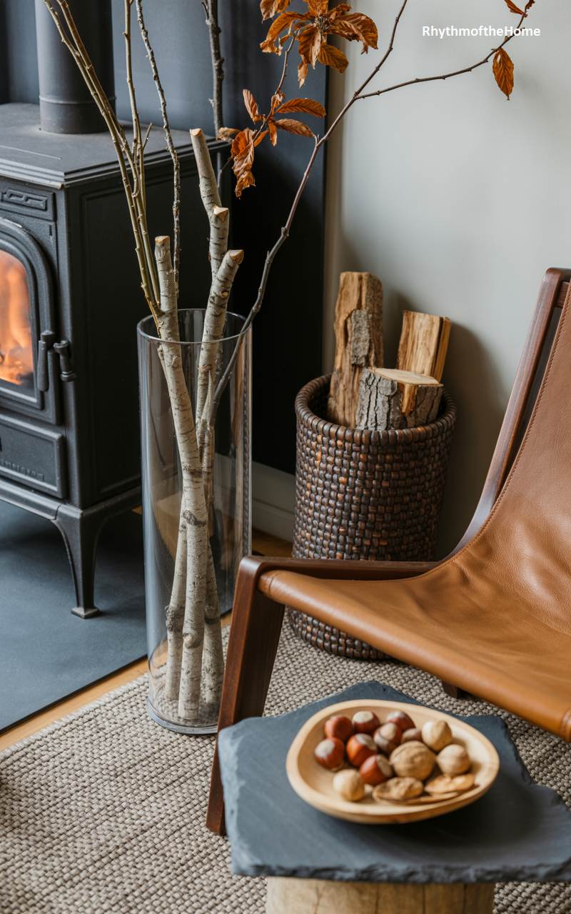 This cozy corner is the perfect distillation of winter comfort and relaxation. A classic black wood-burning stove radiates a gentle warmth, with a woven basket of logs nearby, ready to keep the fire going. An inviting, modern sling chair made of rich cognac leather and dark wood offers the ideal spot to unwind. Natural, textural elements are added through a tall glass vase filled with birch branches and a simple bowl of mixed nuts on a slate side table. This is a minimalist yet deeply comforting nook for enjoying life’s simple pleasures.