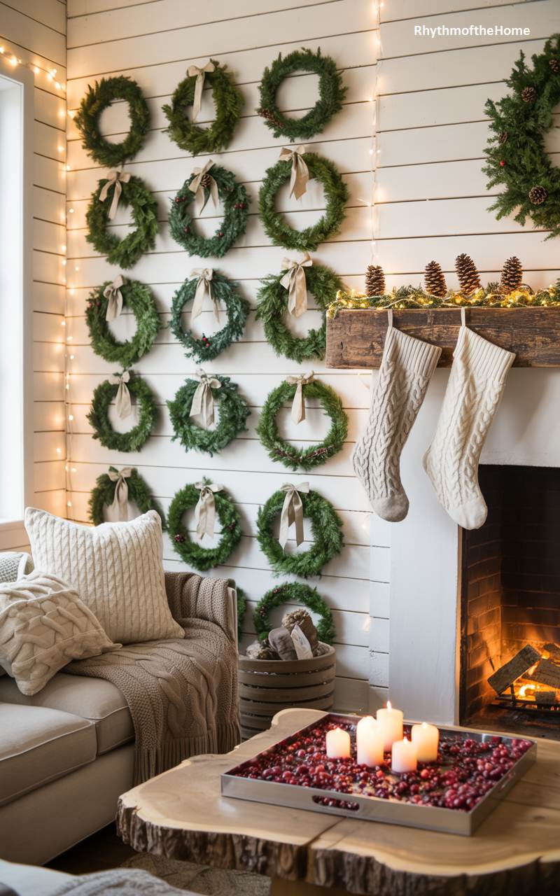 This living room exudes a warm and welcoming farmhouse charm, perfect for a cozy winter gathering. The standout feature is the creative accent wall, where a grid of sixteen simple evergreen wreaths creates a stunning, natural art installation against the white shiplap. A rustic wooden mantelpiece above the fireplace is adorned with pinecones and greenery, from which hang two chunky, cable-knit Christmas stockings. The crackling fire adds warmth and movement, while a tray on the coffee table filled with cranberries and floating candles provides a final, homespun festive touch.
