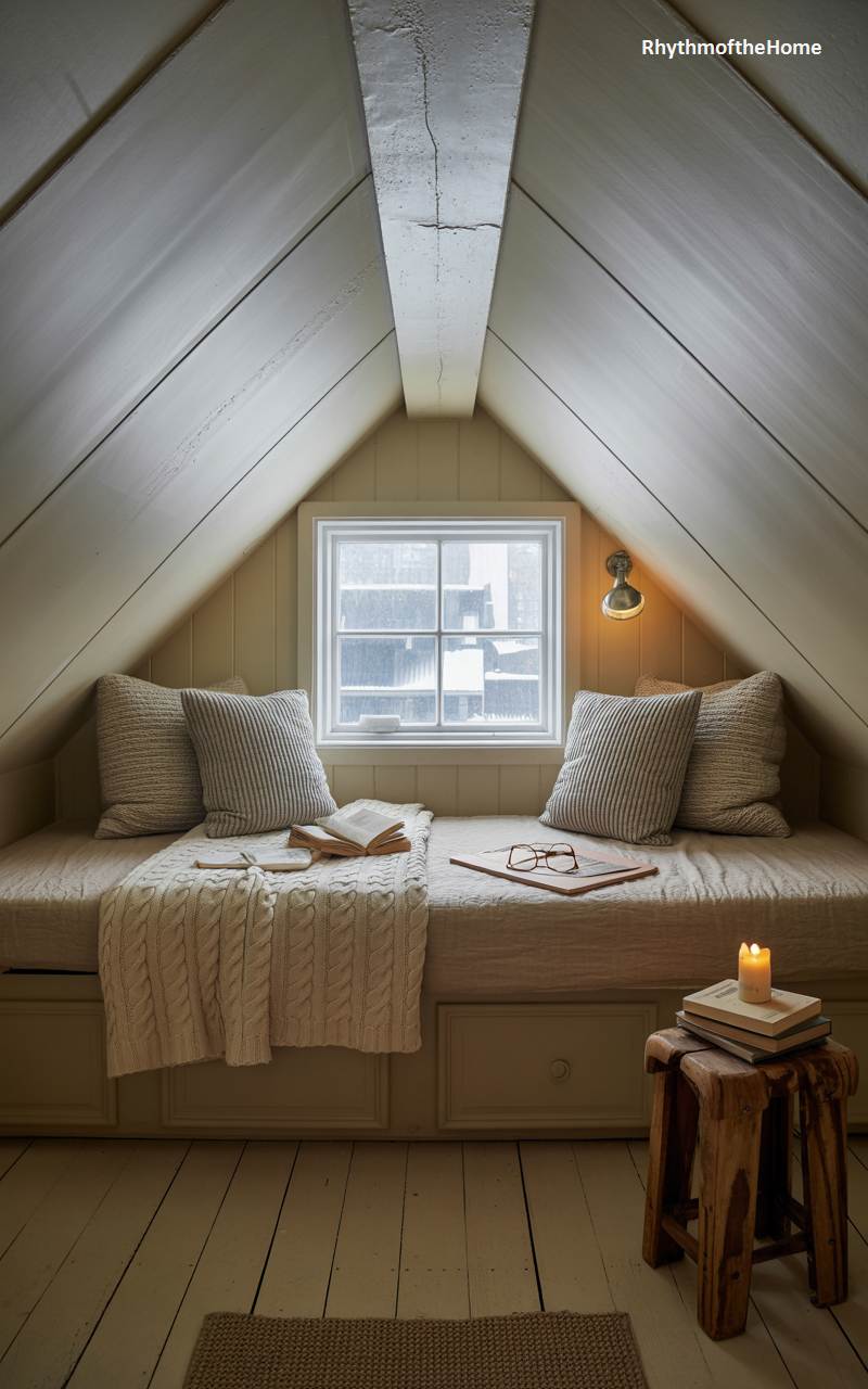 Tucked away beneath the sloped roof, this attic reading nook is the ultimate secret hideaway for a winter’s day. The angled, painted wood-paneled ceiling creates an incredibly comforting, cocoon-like feeling. A built-in daybed, piled with soft, striped pillows and a cozy cable-knit throw blanket, offers the perfect spot to relax with a book or watch the snow fall. The intimate ambiance is enhanced by a single lit candle resting on a stack of books, making this a truly peaceful and secluded escape from the world.